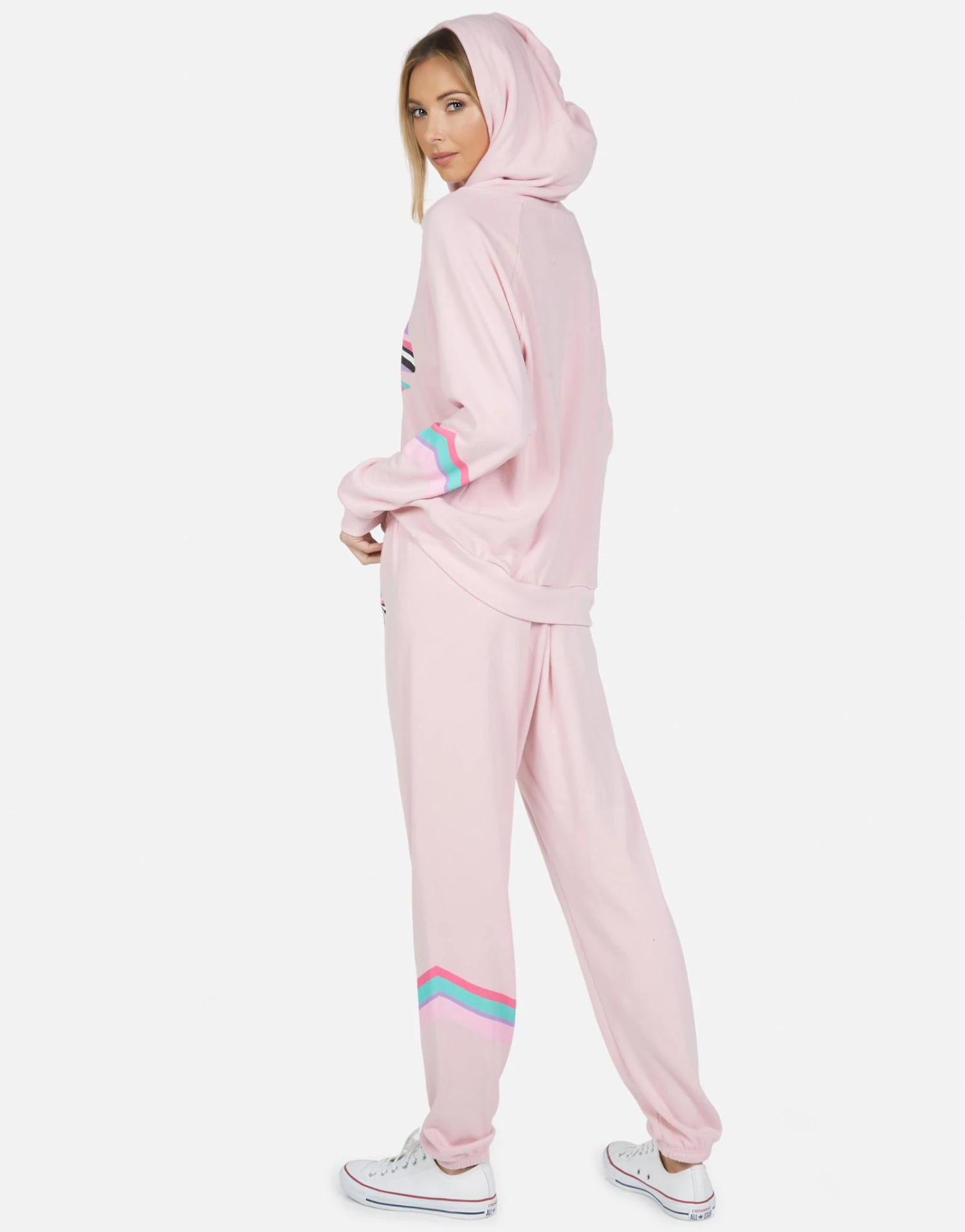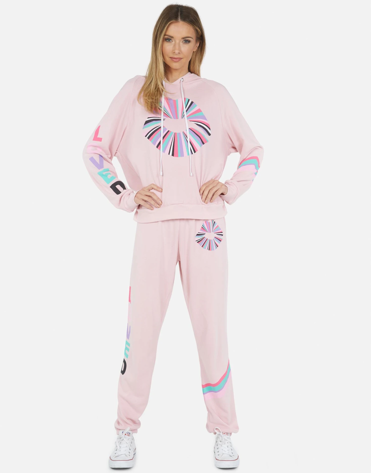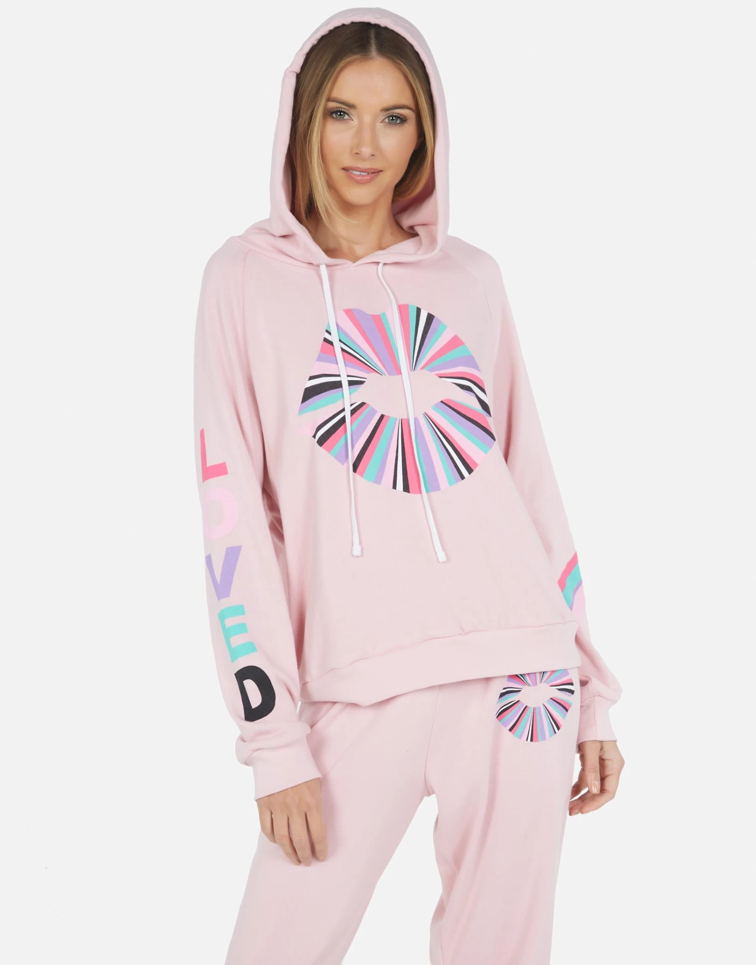 Rainbow Ray Lip Printed on Ultra Soft Lightweight Pullover Hoodie in Pink Nectar by Lauren Moshi.