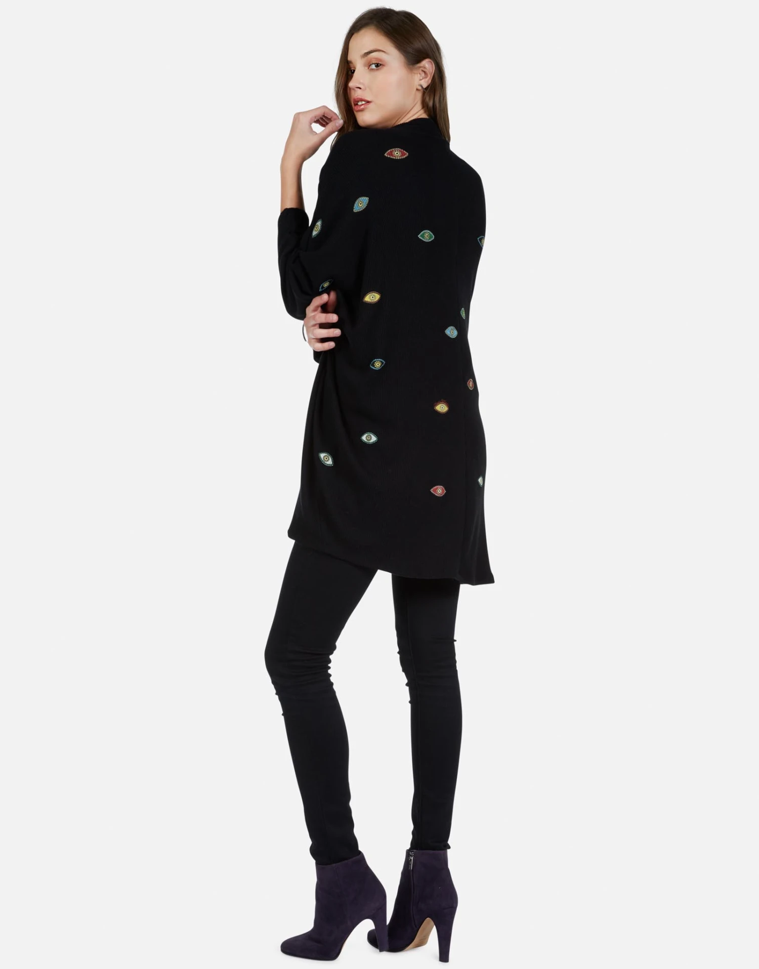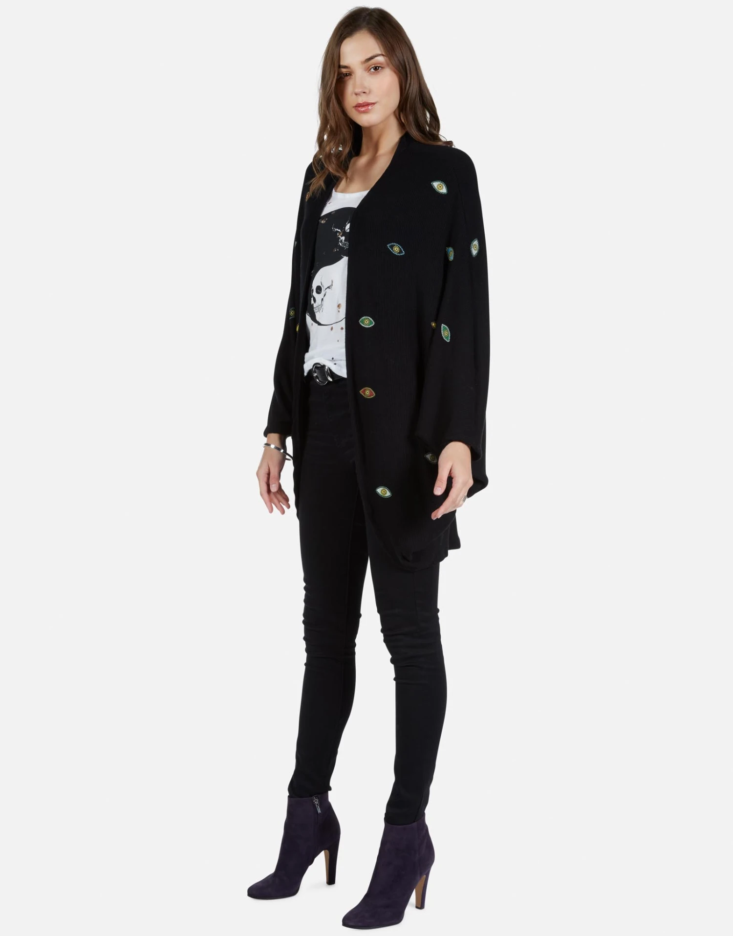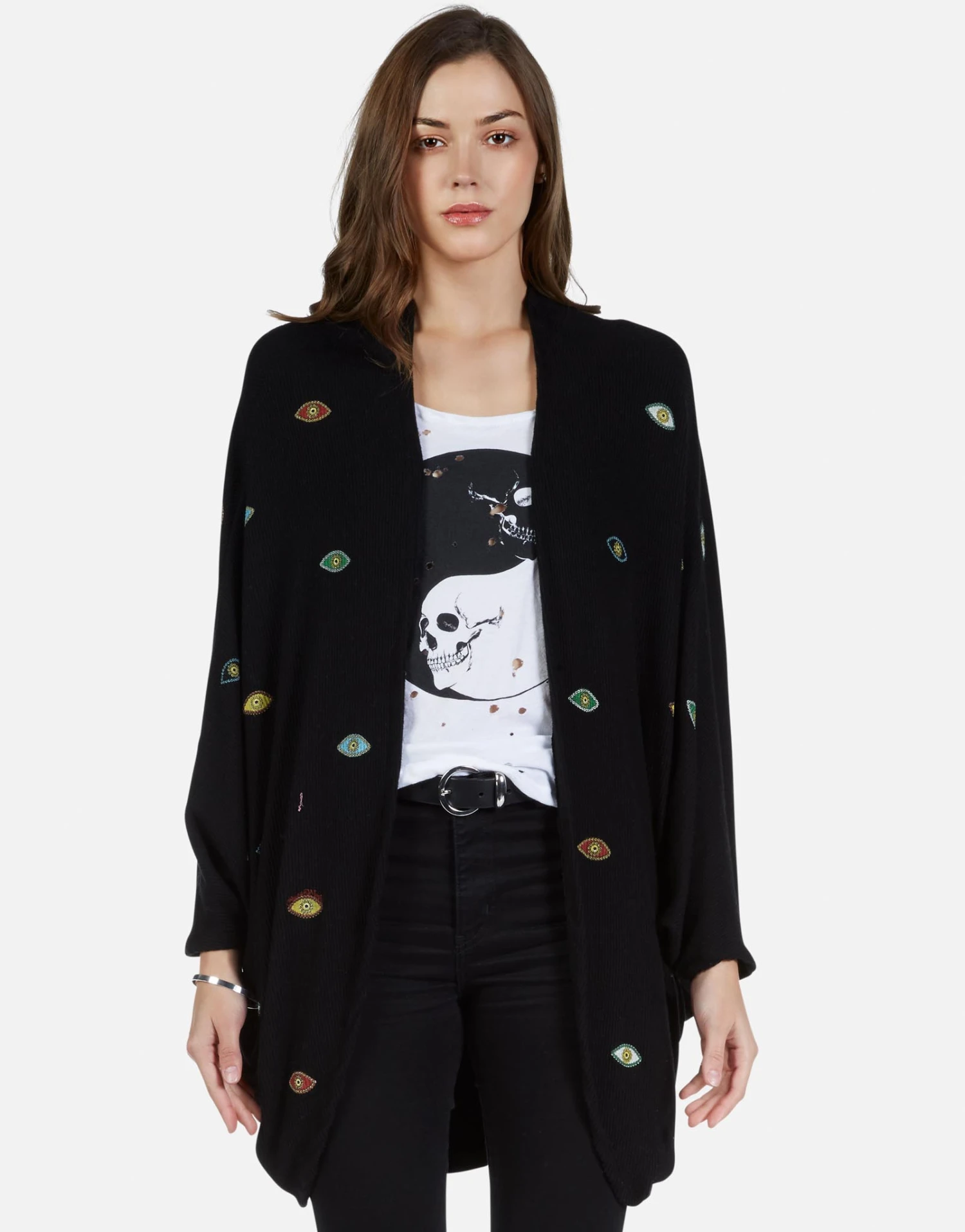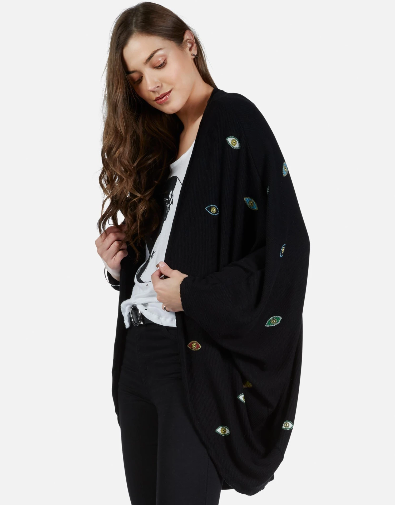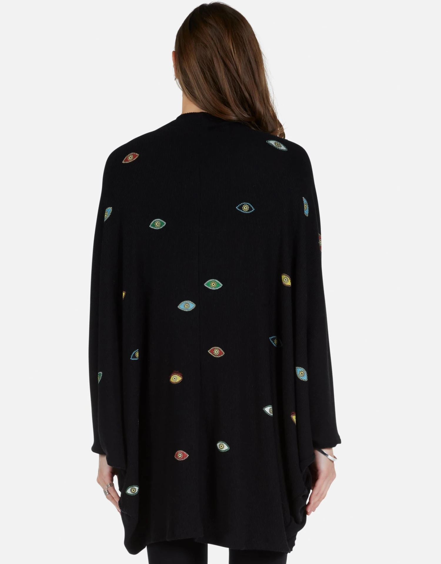 Color Bead Eyes Printed on Ultra Soft Cardigan Wrap in Black by Lauren Moshi.