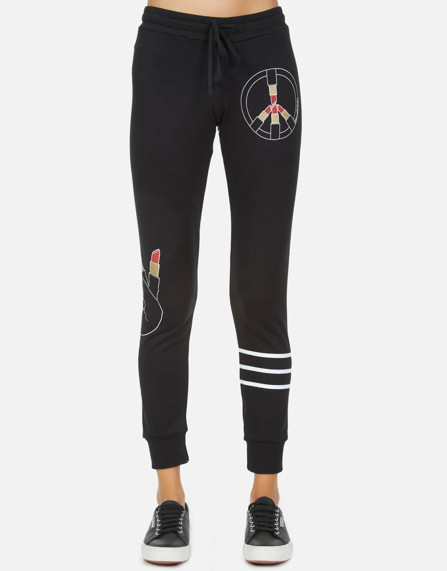 Lipstick Peace Printed on Ultra Soft Lightweight Sweatpant in Black by Lauren Moshi.