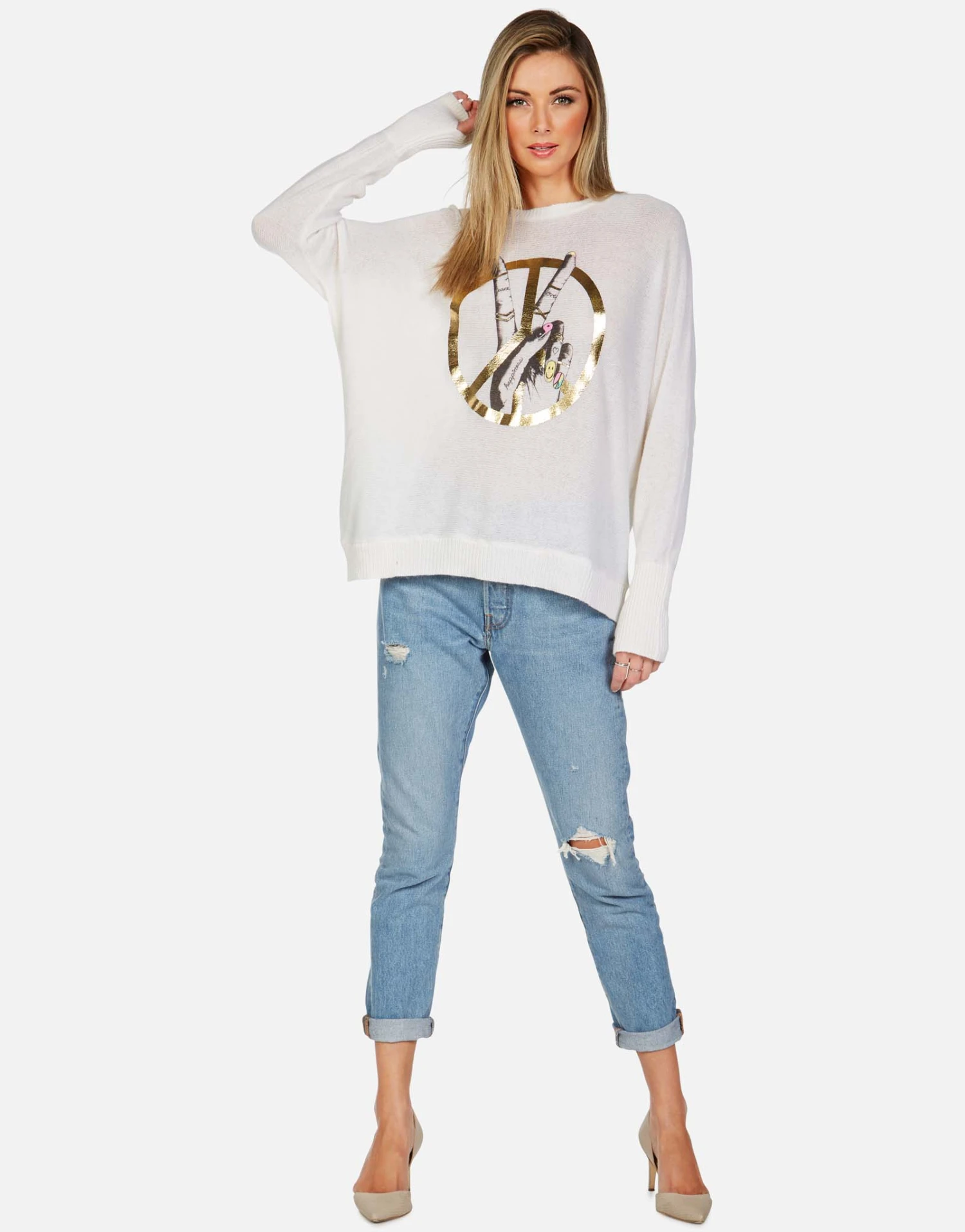 Peace Sign Hand Printed on Ultra Soft Cashmere Sweater in Creme by Lauren Moshi.