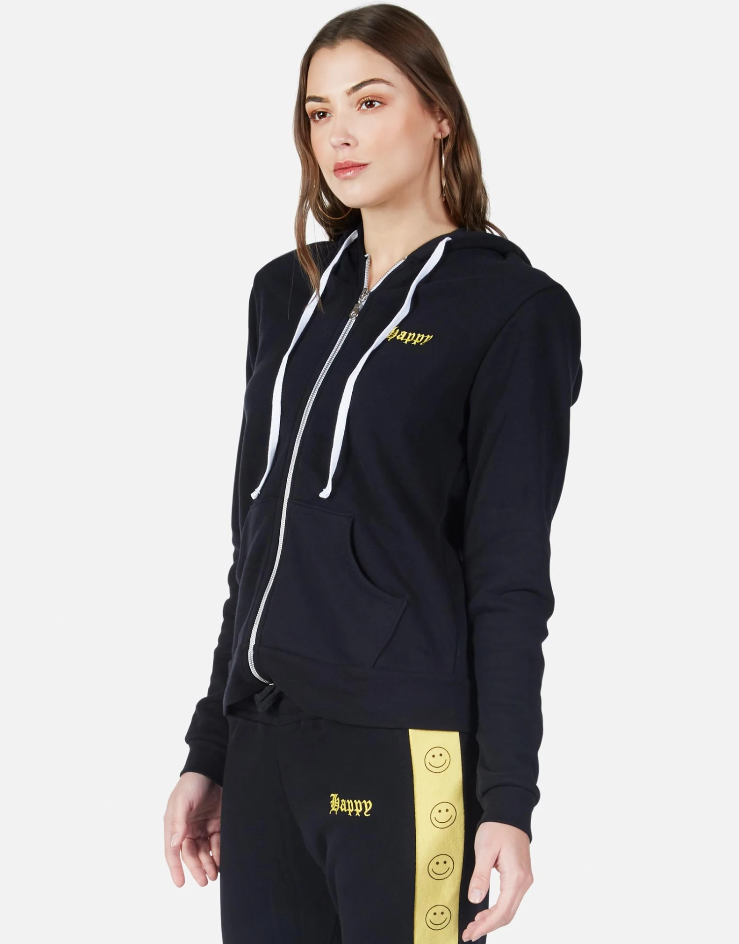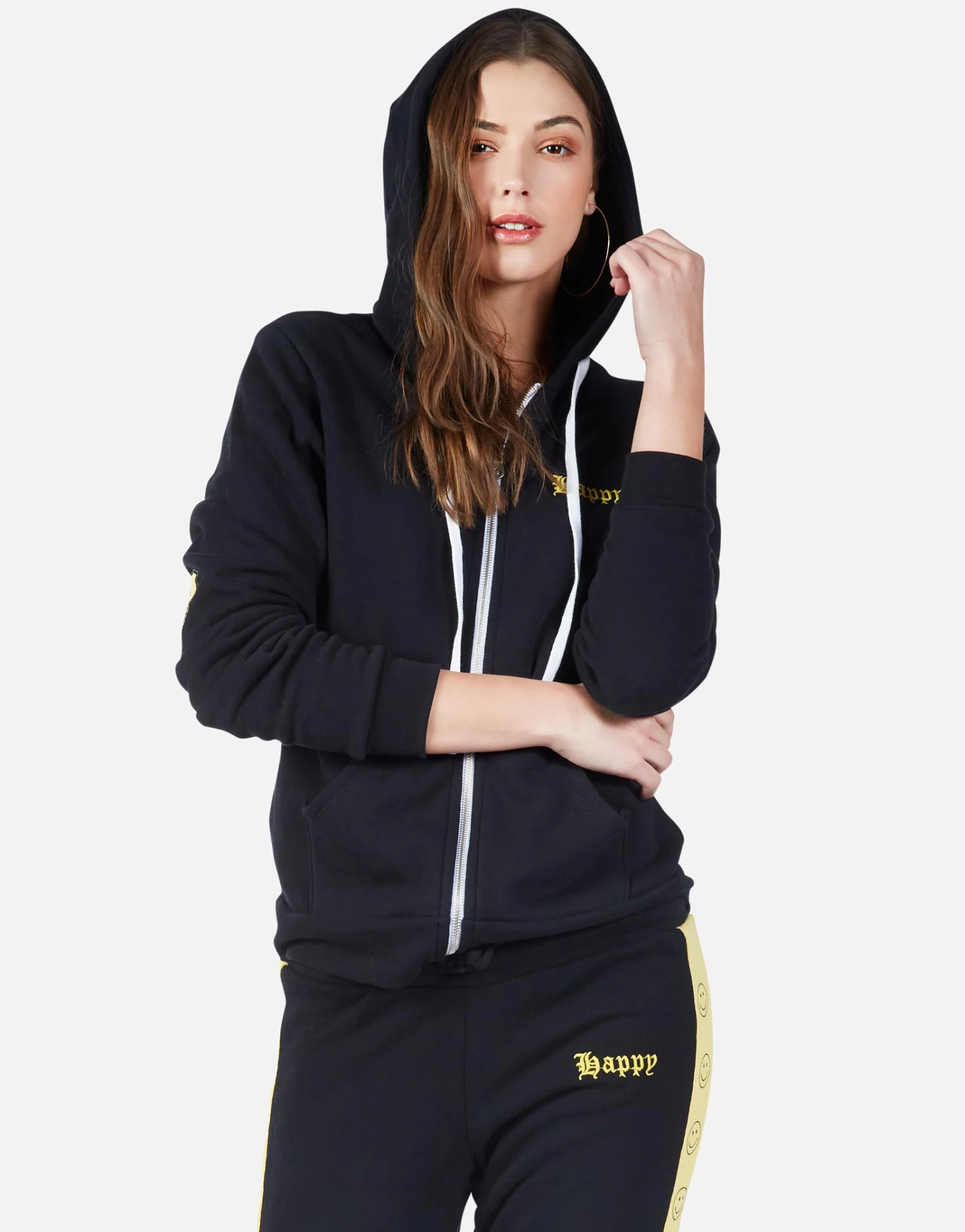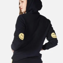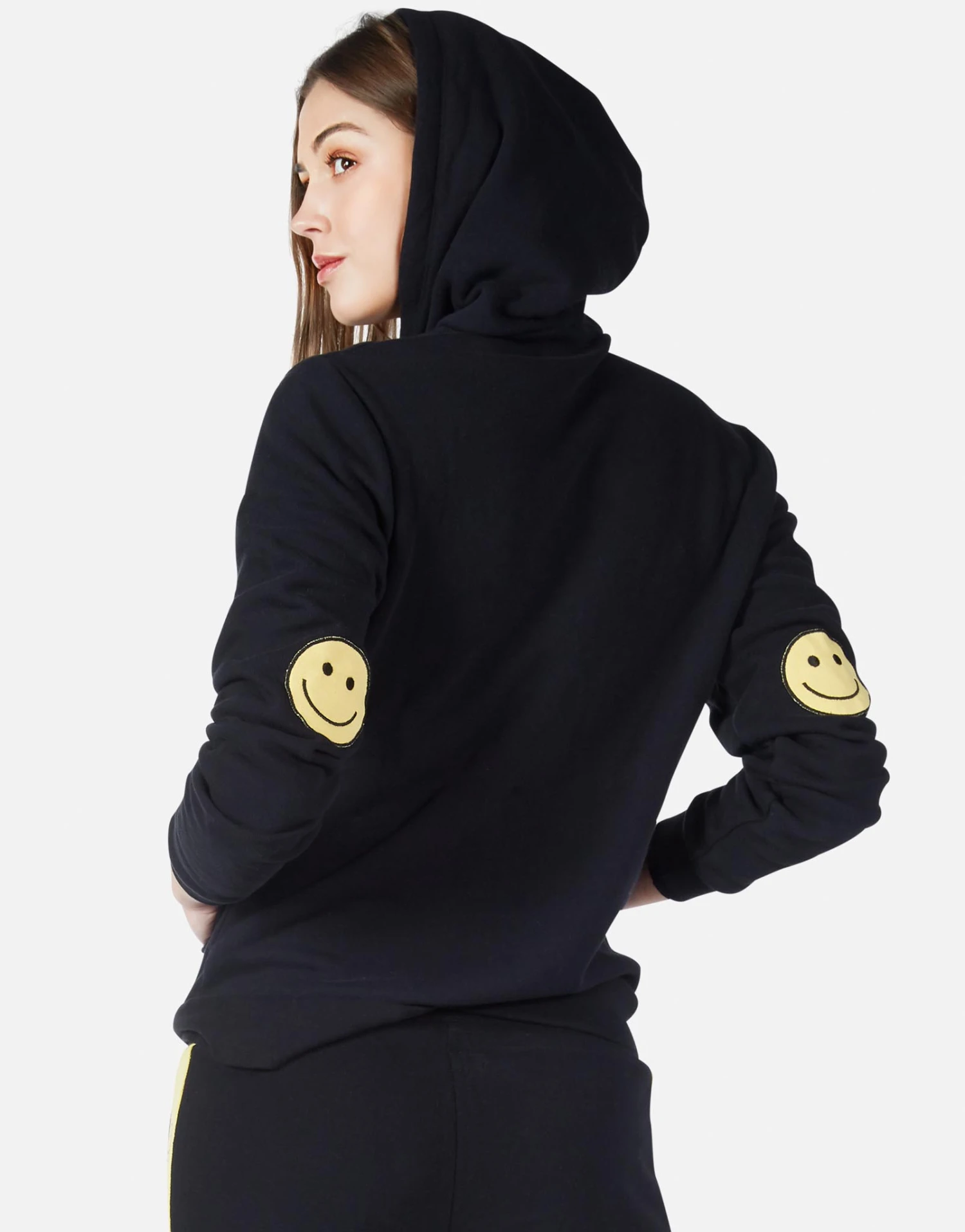 Happy Embroidery w/ Smiley Patches on Super Soft Pullover Hoodie in Black by Lauren Moshi.