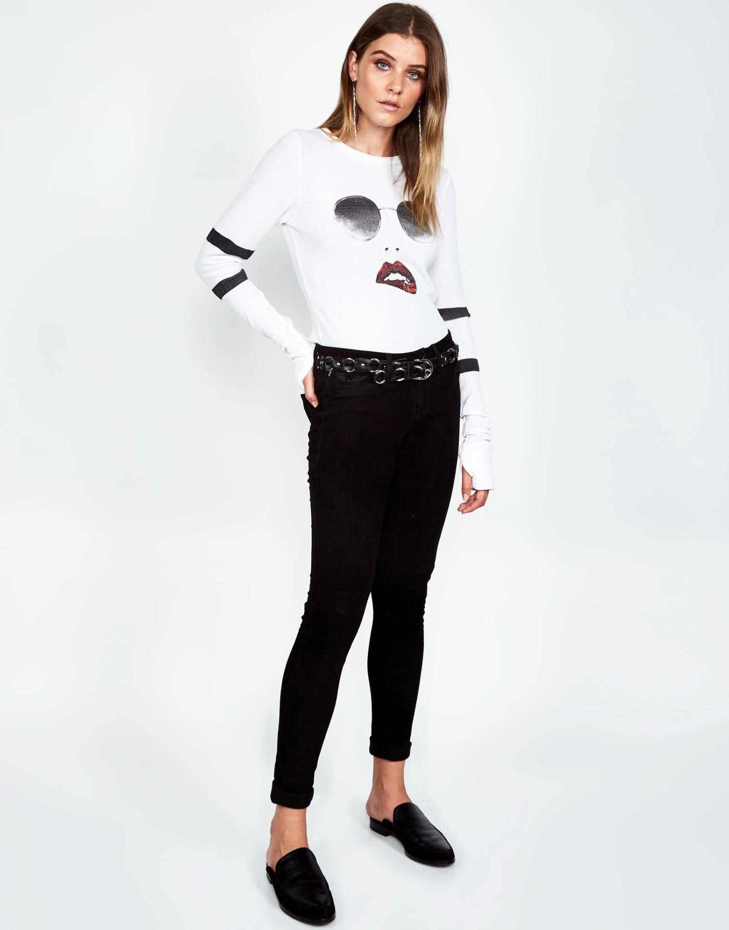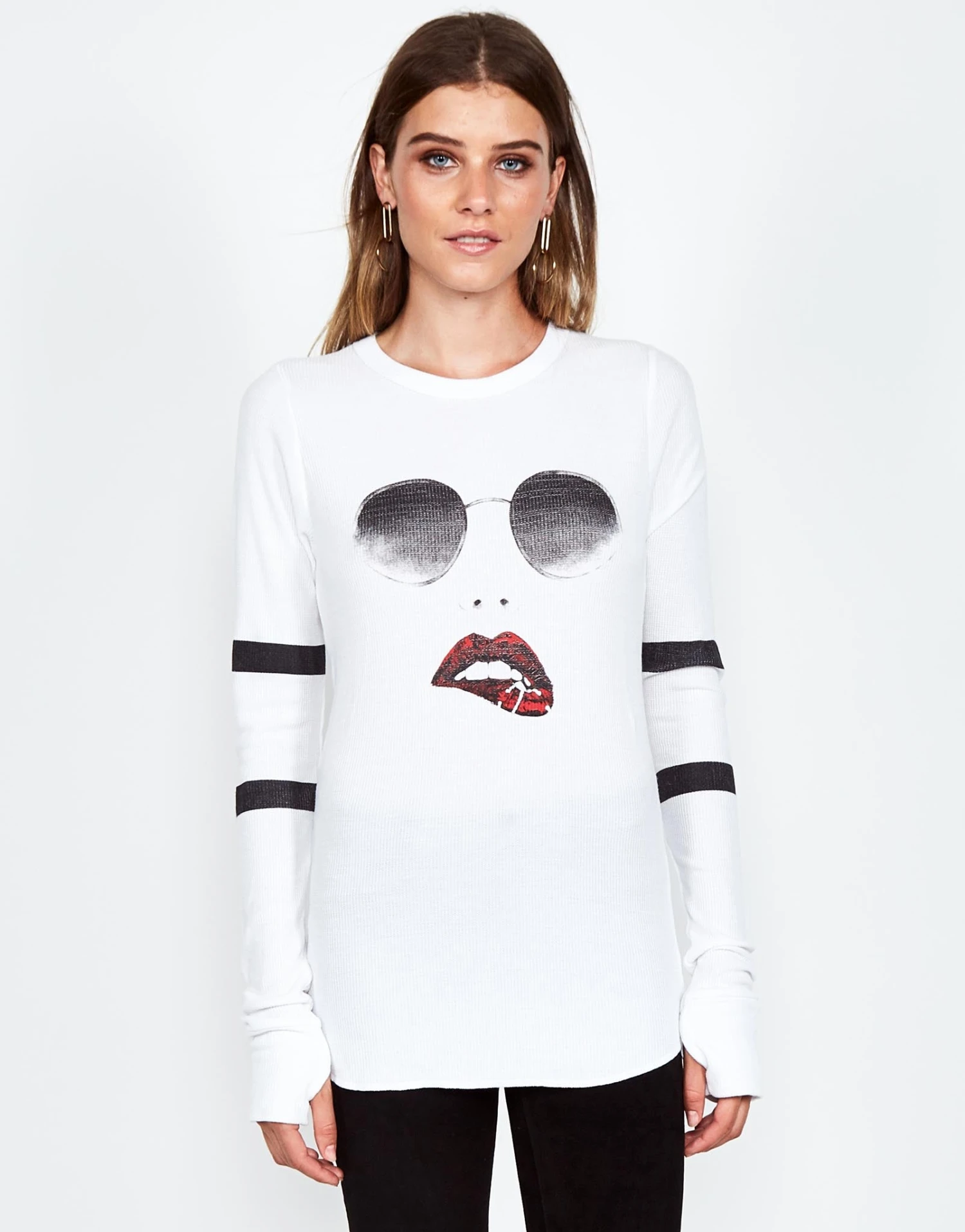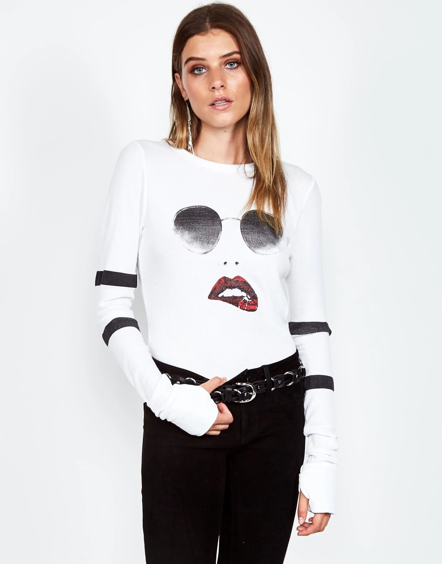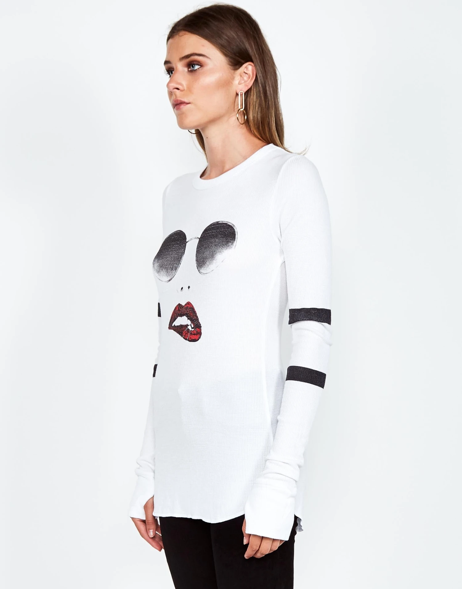 Pierced Biting Lip Face Printed on Ultra Soft Lightweight Thermal in White by Lauren Moshi.