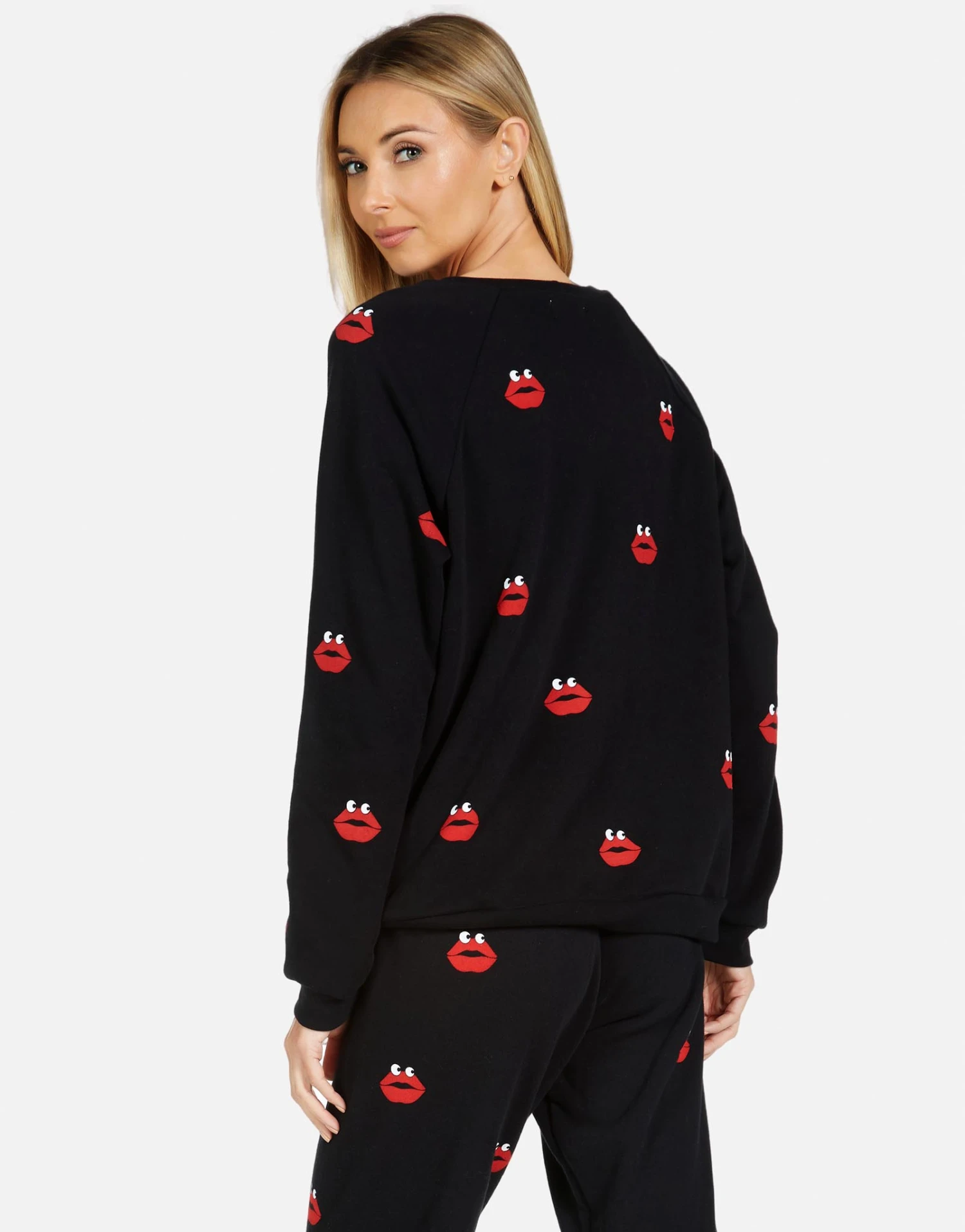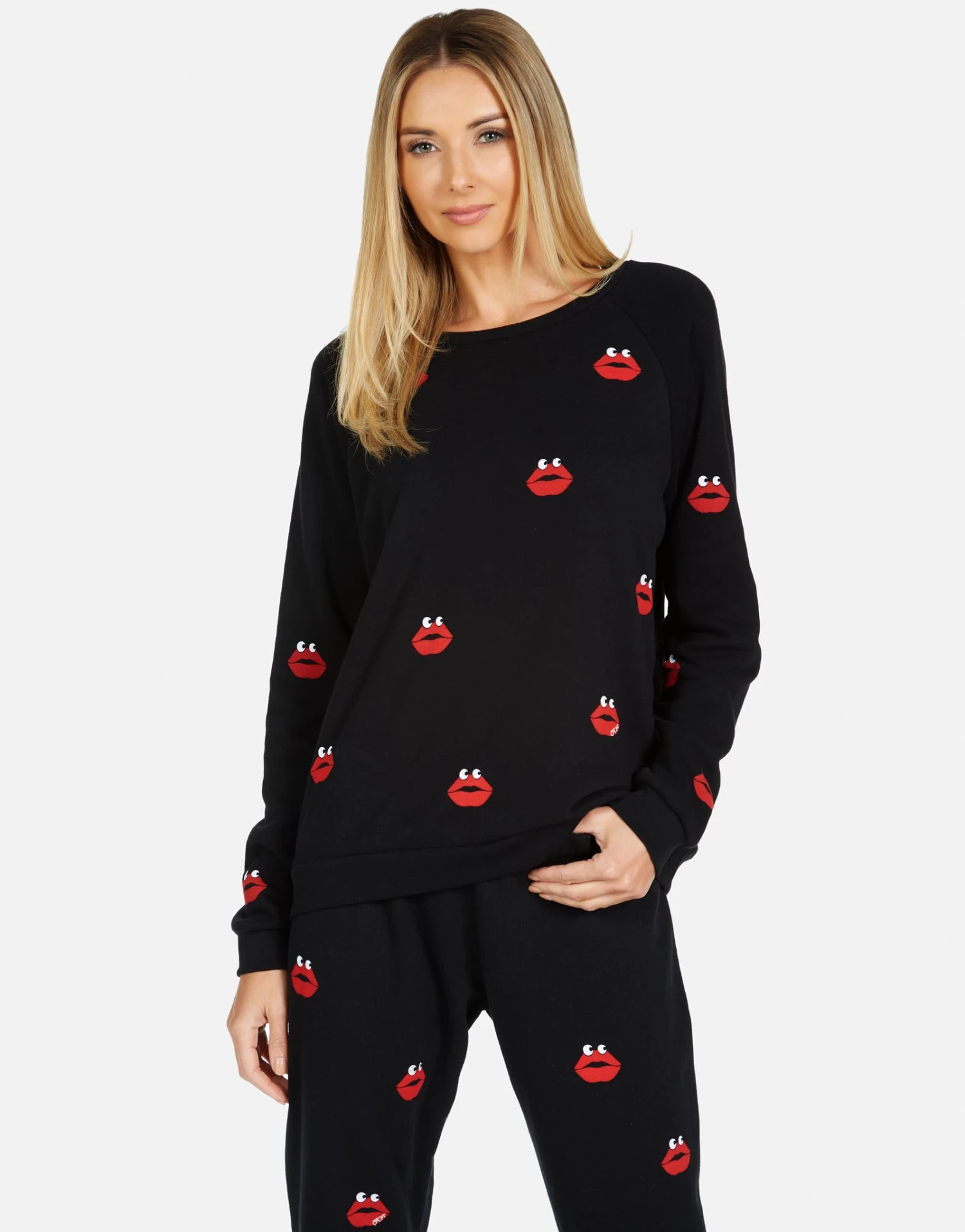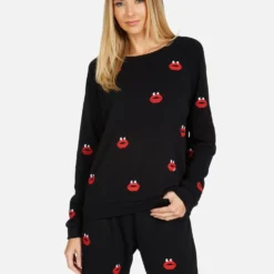 Kiss Face Printed on Ultra Soft Lightweight Pullover in Black by Lauren Moshi.