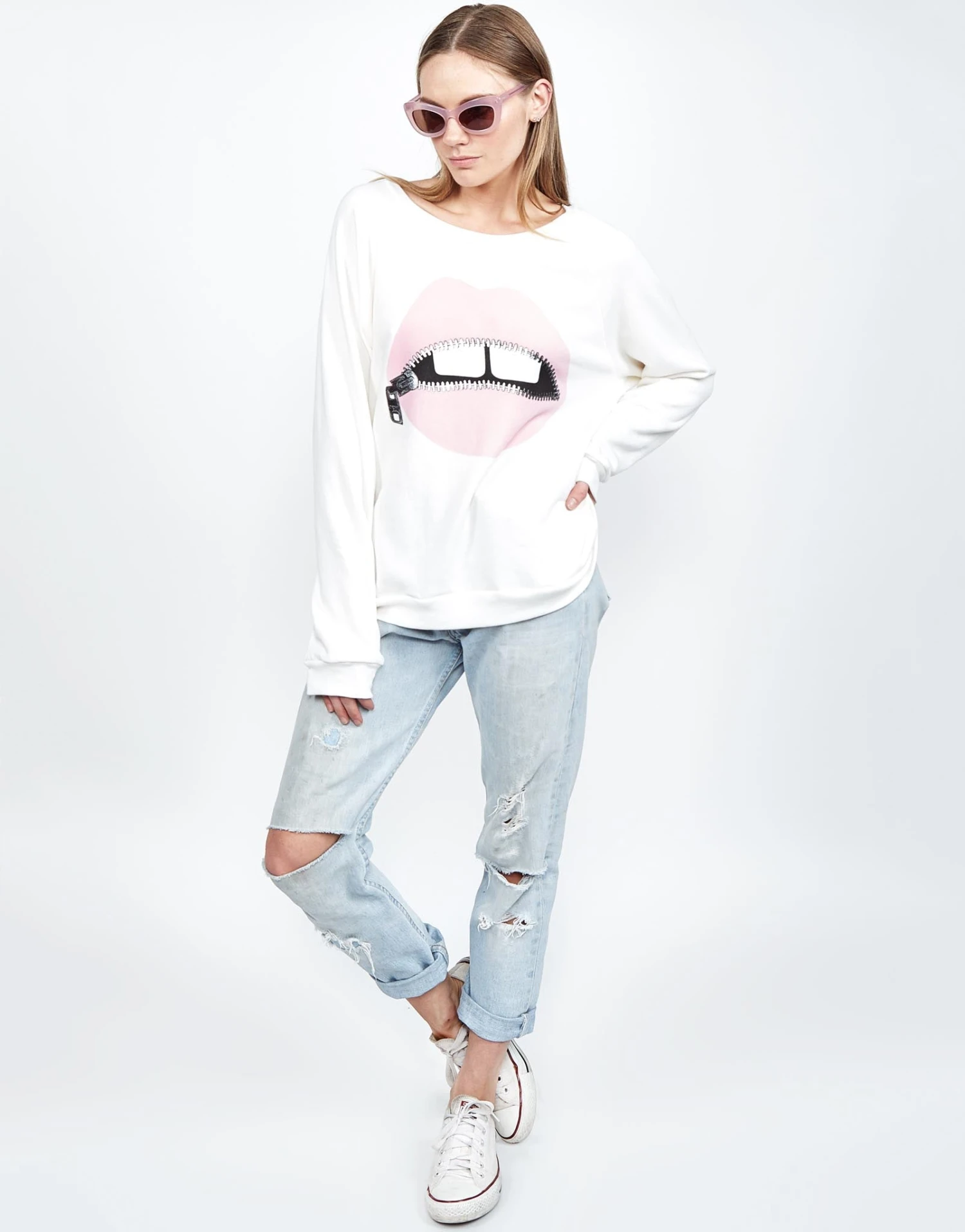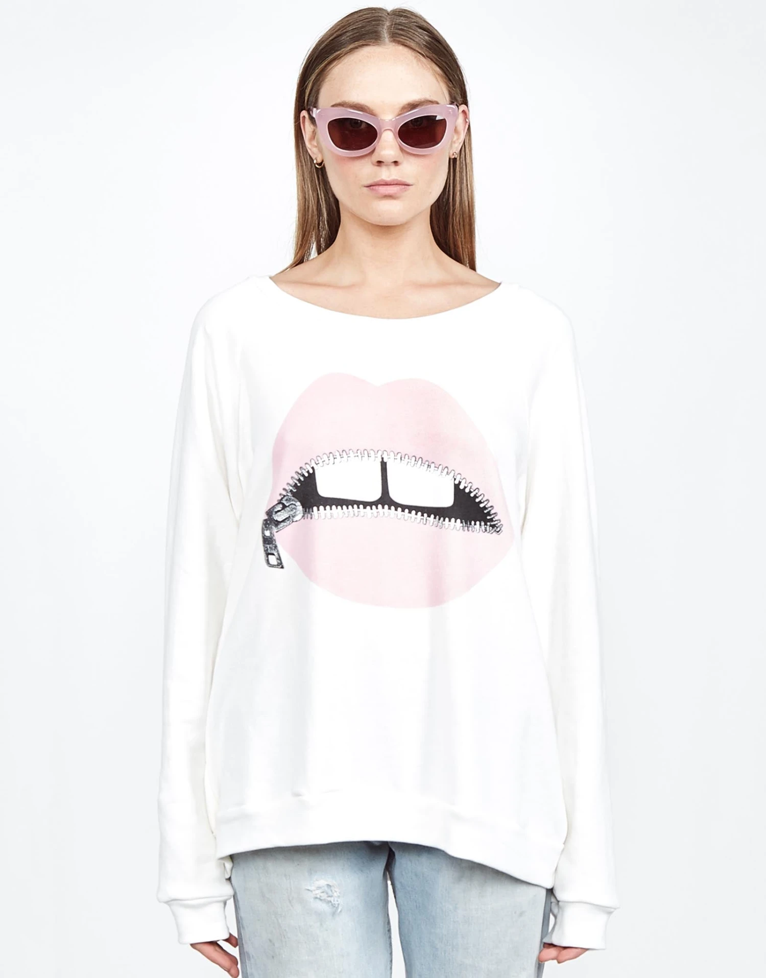 Pink Foil Zipper Mouth Printed on Ultra Soft Lightweight Pullover in Milk by Lauren Moshi.