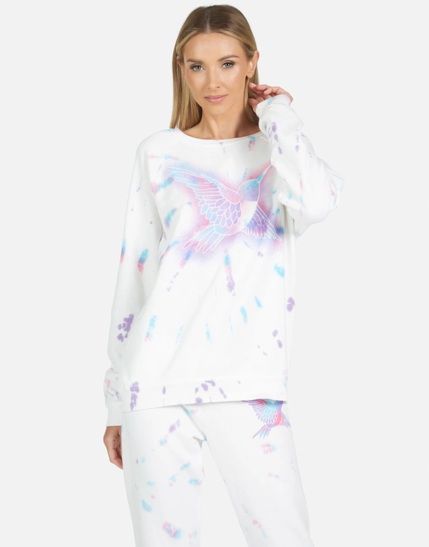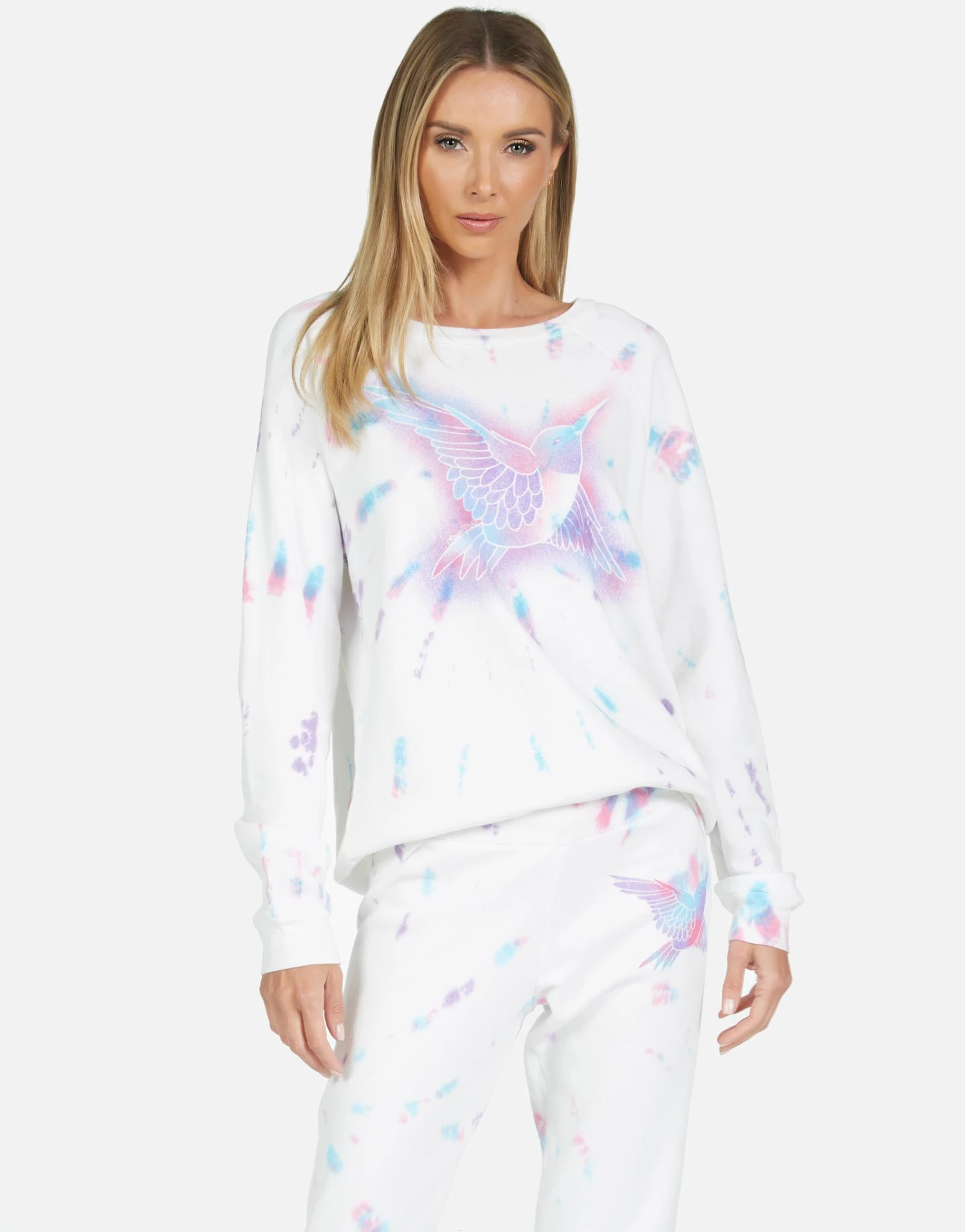 Hummingbird Printed on Ultra Soft Lightweight Pullover in Pastel Splash by Lauren Moshi.