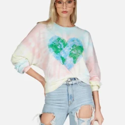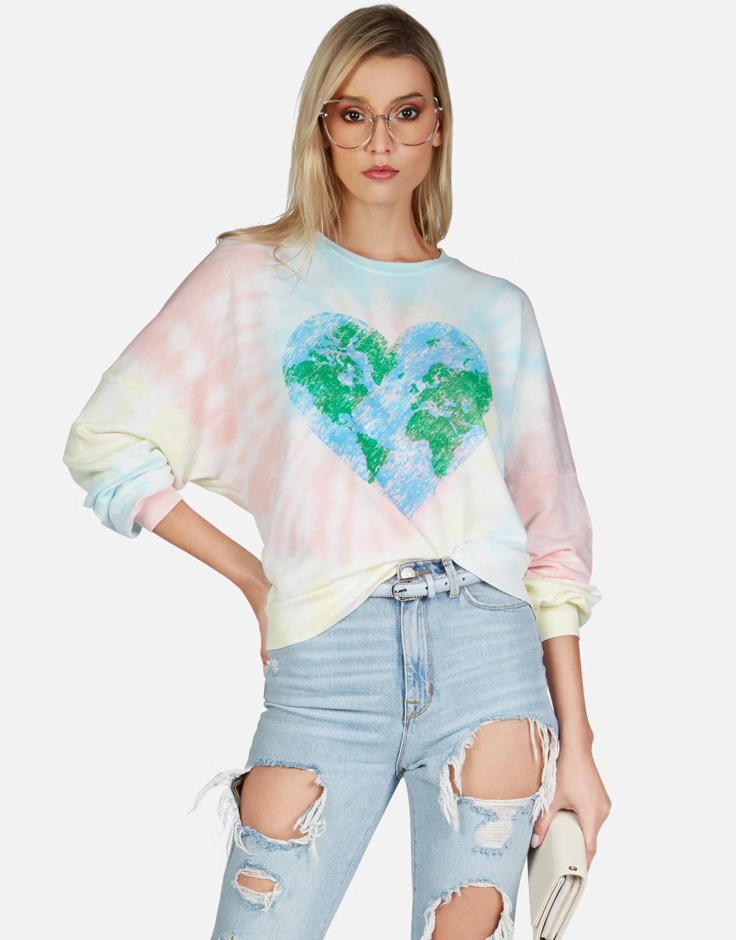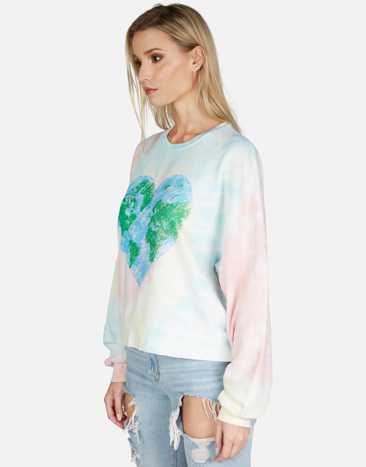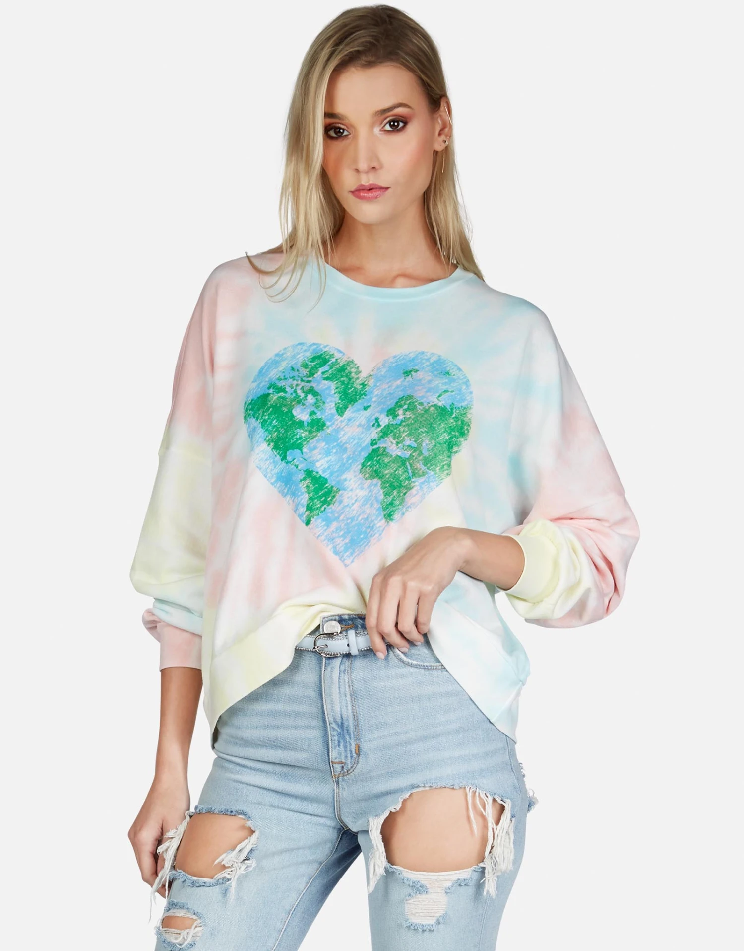 World Love Printed on Ultra Soft Lightweight Boyfriend Pullover in Tropic Twist by Lauren Moshi.