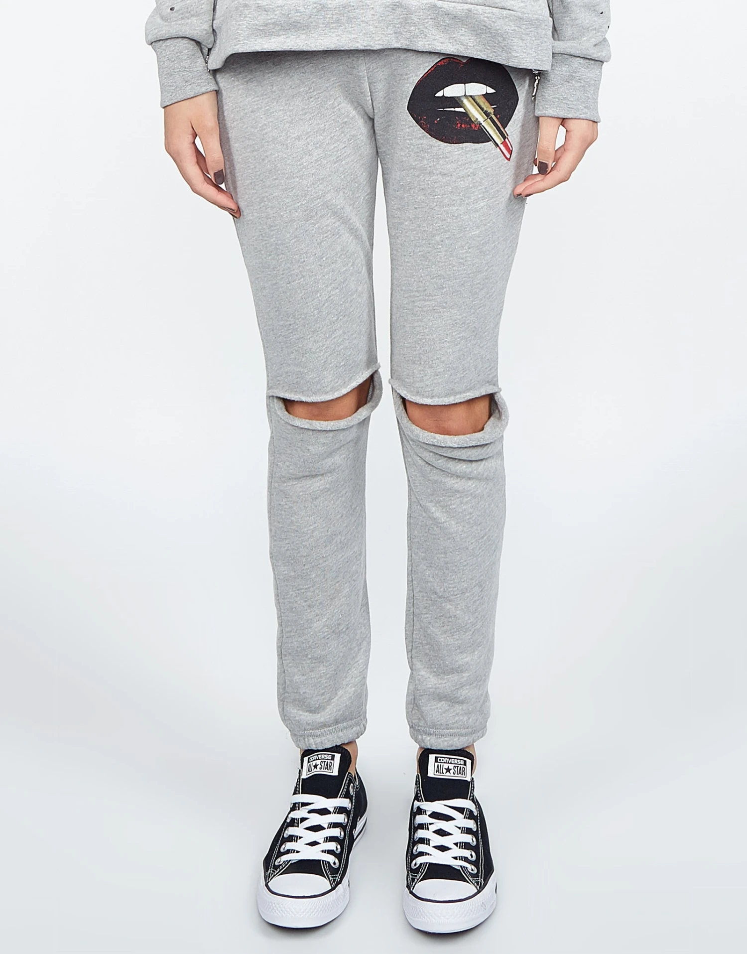 Lipstick Mouth Printed on Super Soft Women’s Jogger with Knee Slits in Heather Grey by Lauren Moshi.