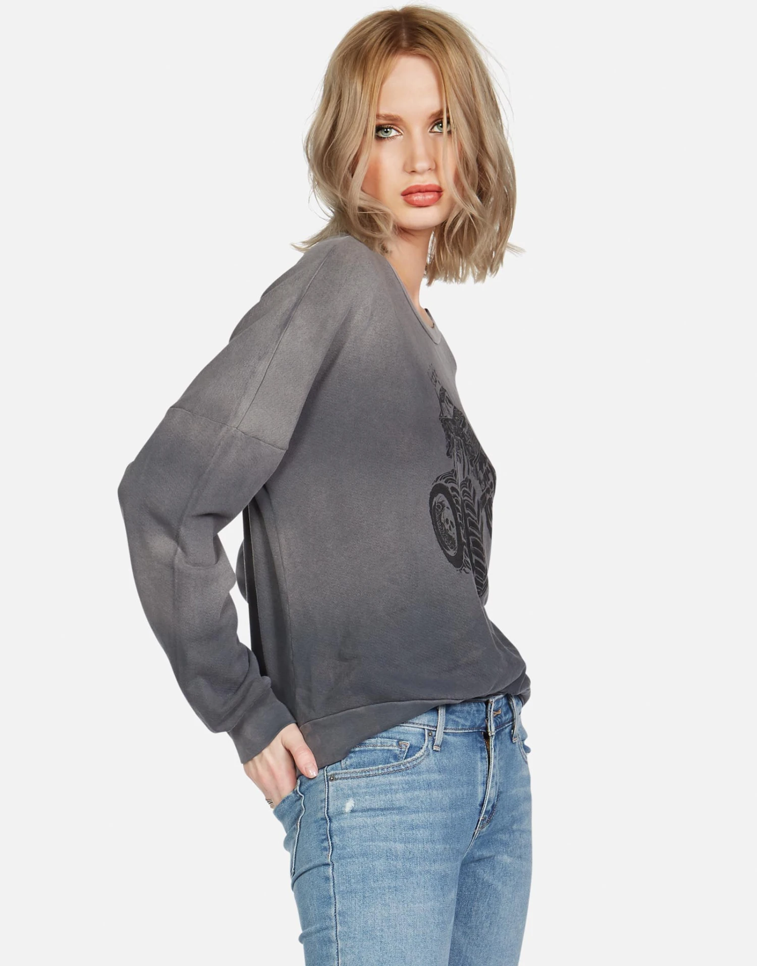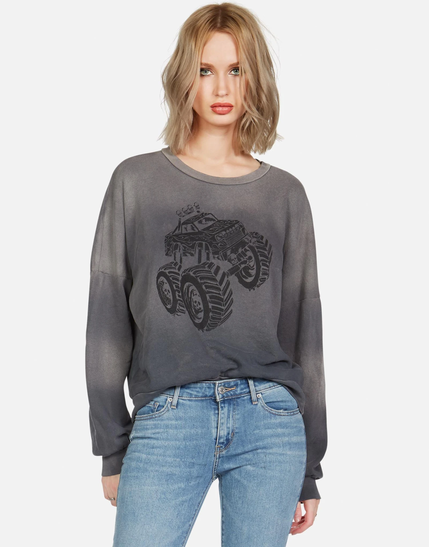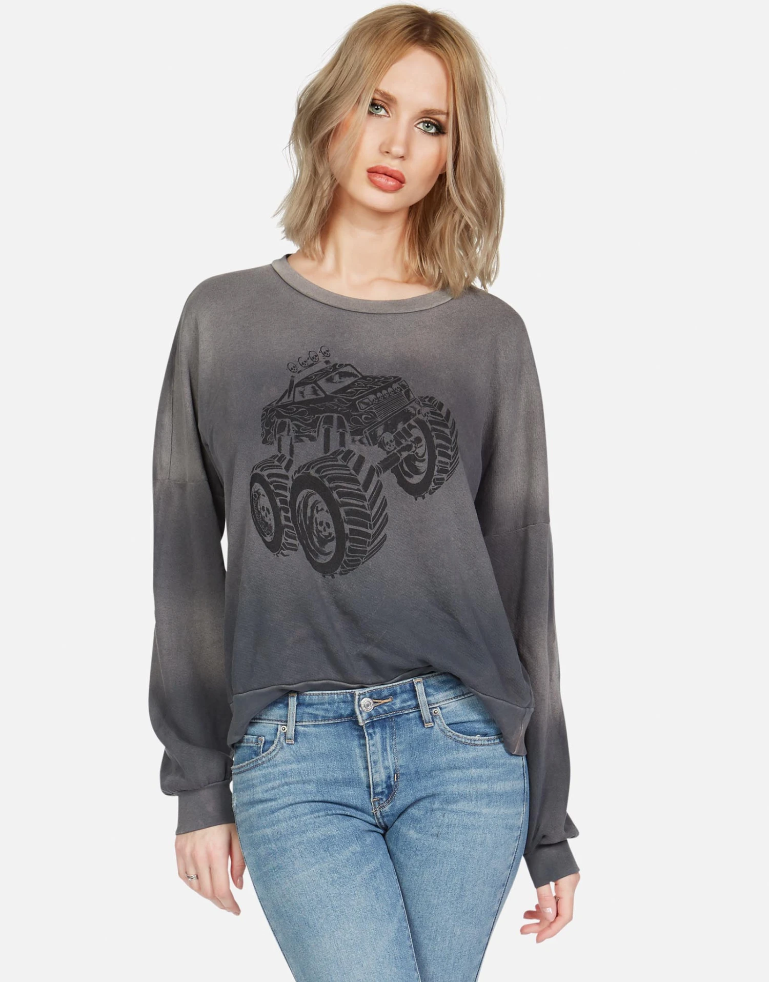 Monster Truck Printed on Ultra Soft Lightweight Boyfriend Pullover in Faded Graphite by Lauren Moshi.