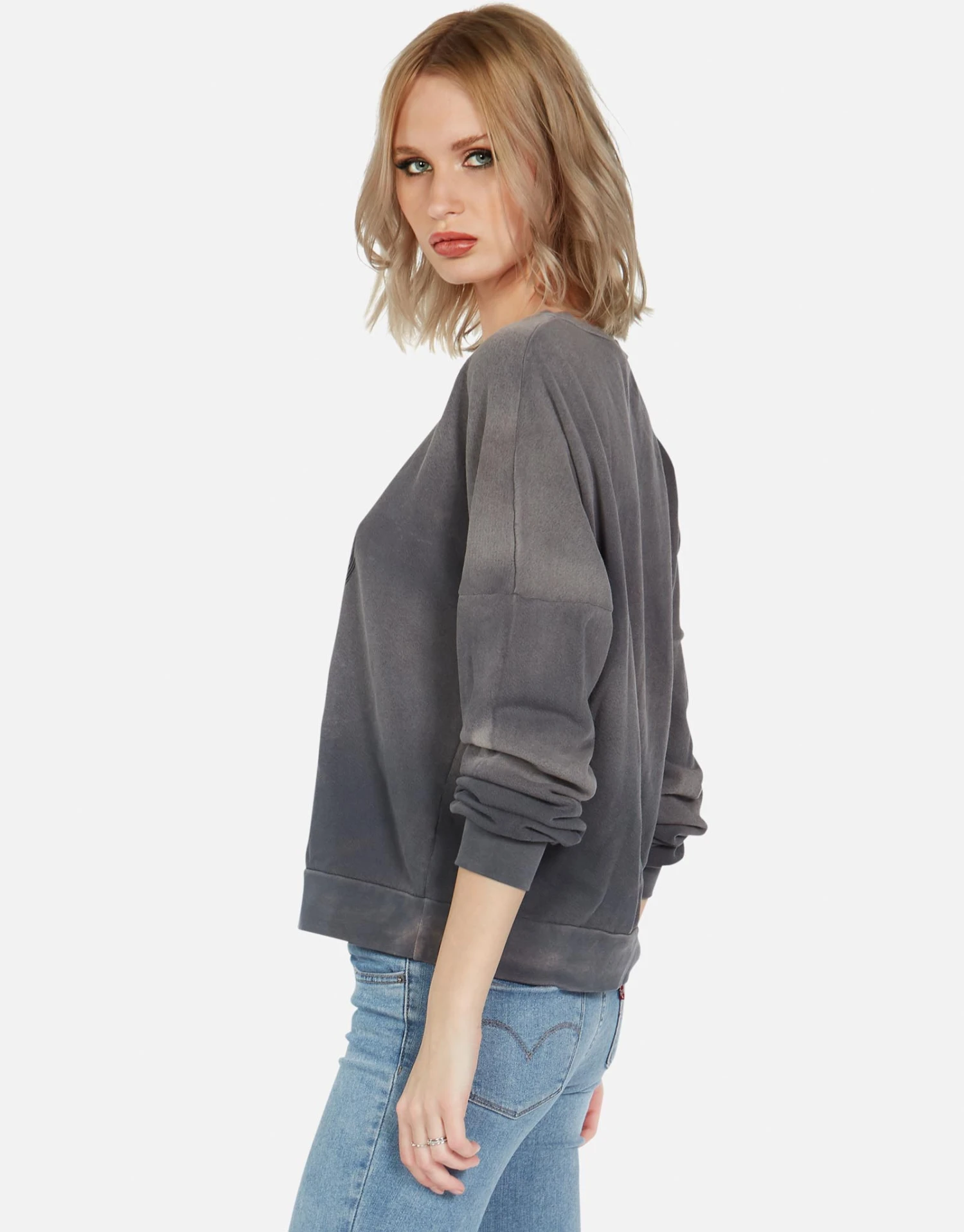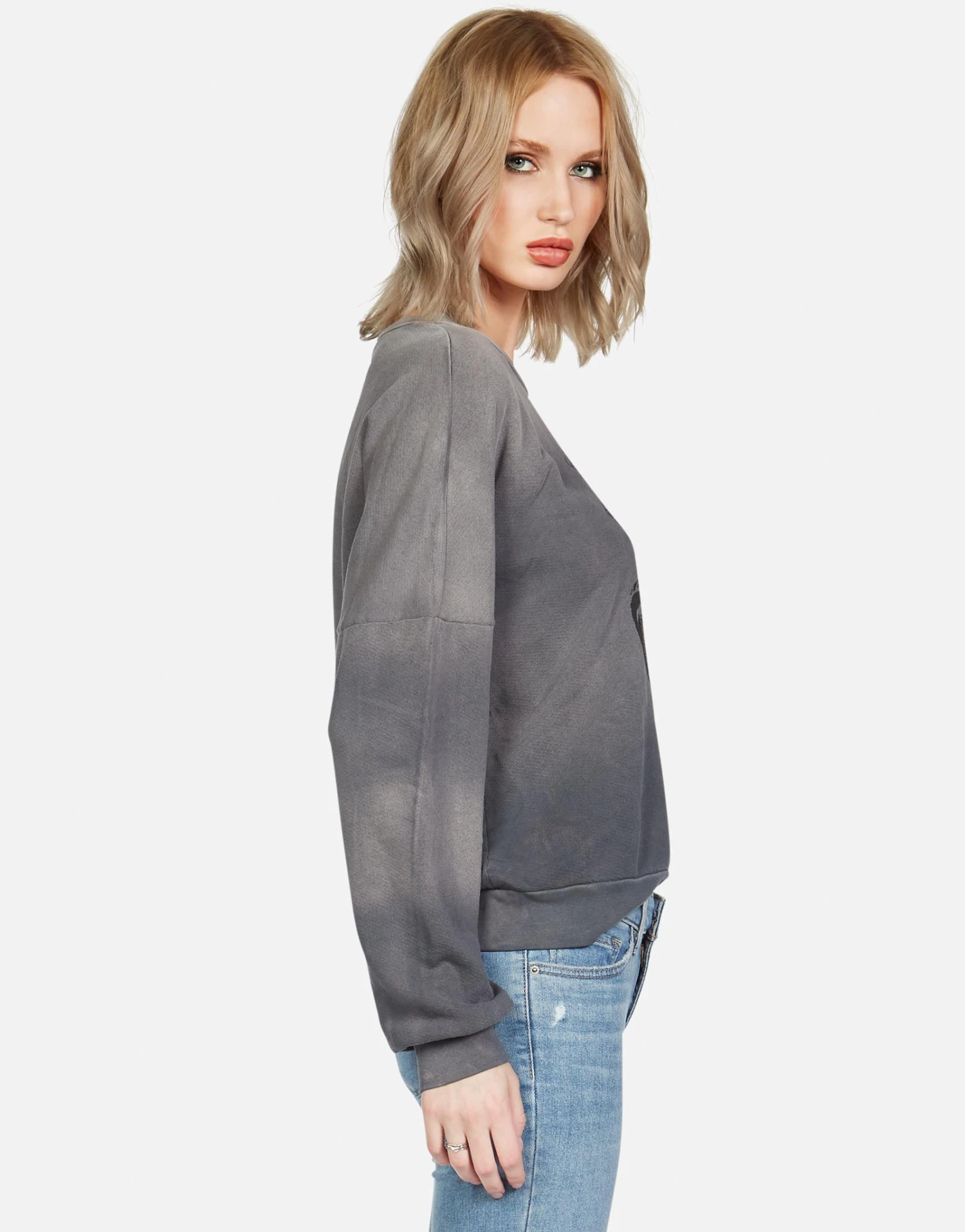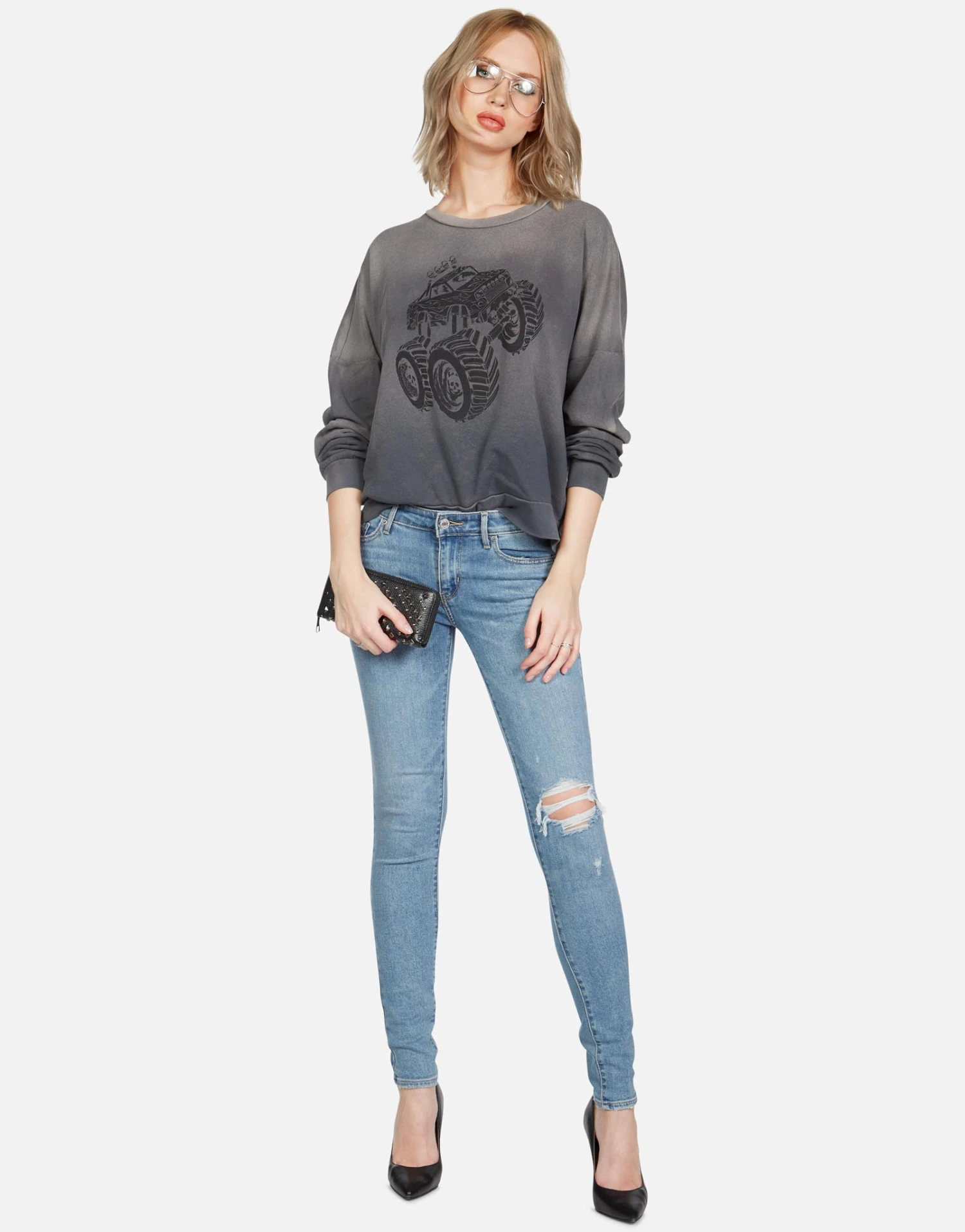 Monster Truck Printed on Ultra Soft Lightweight Boyfriend Pullover in Faded Graphite by Lauren Moshi.