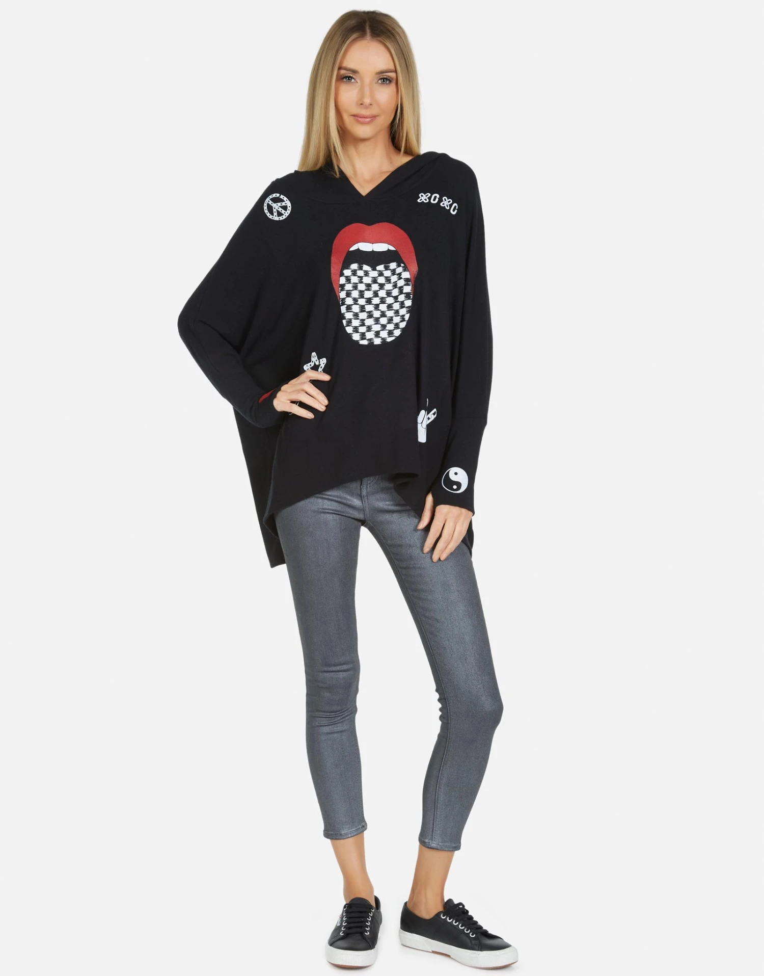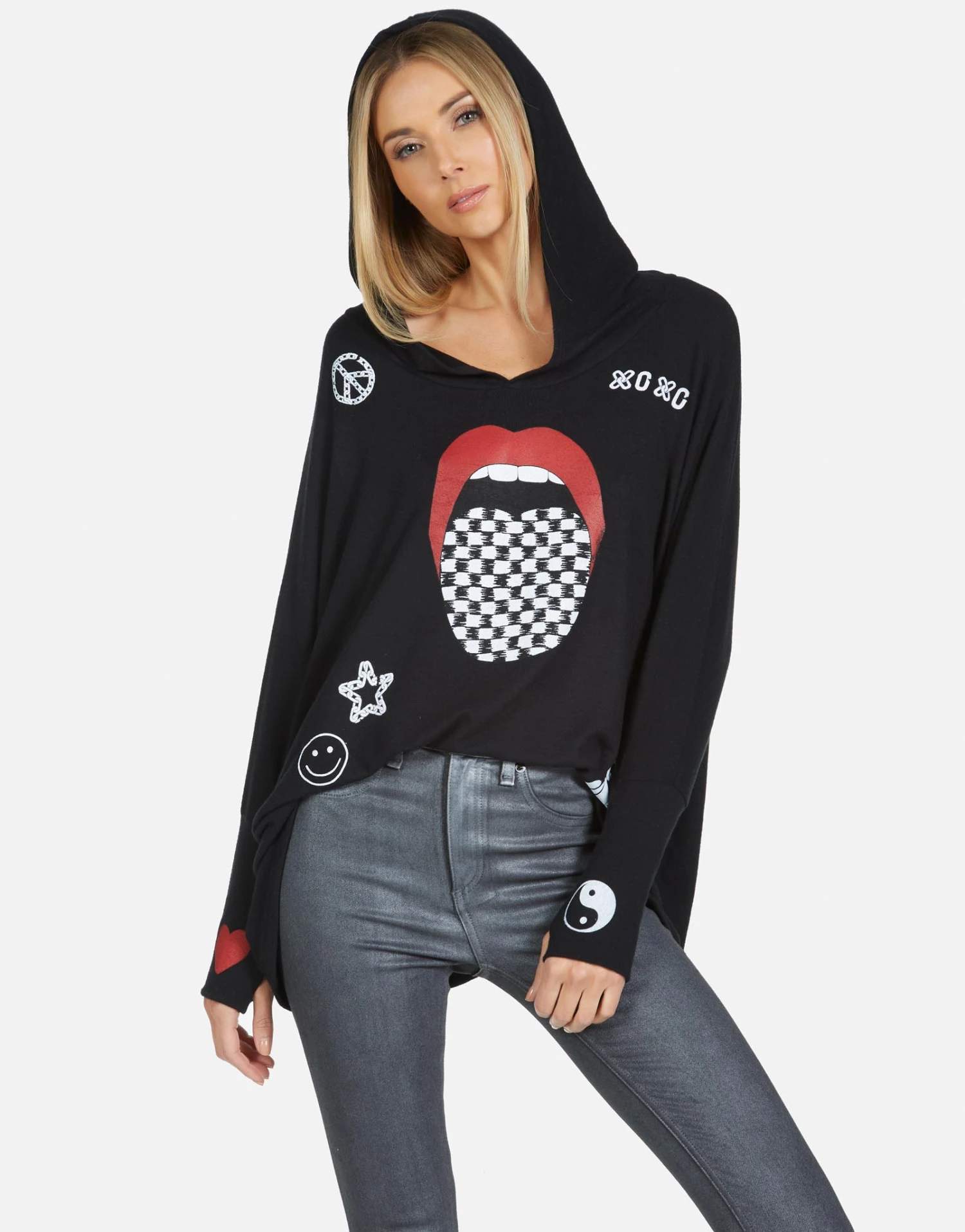 Checker Tongue Printed on Ultra Soft Lightweight Hoodie in Black by Lauren Moshi.