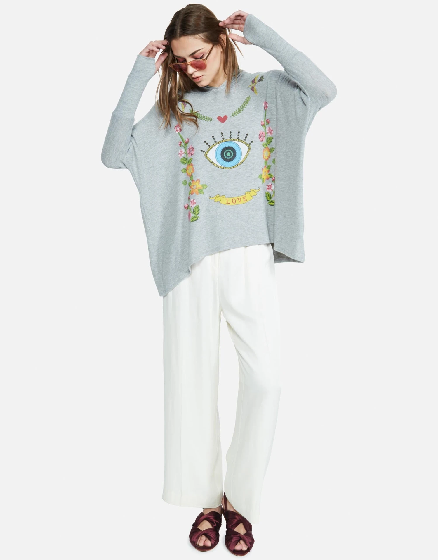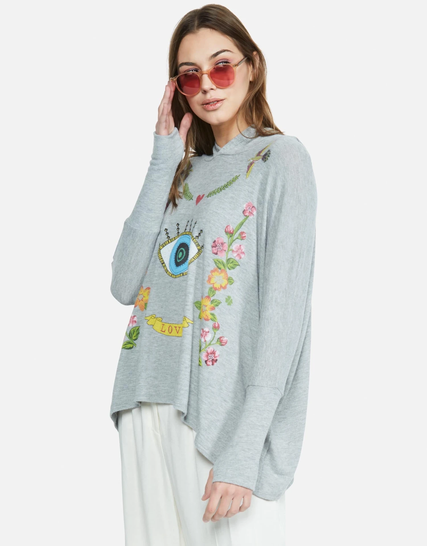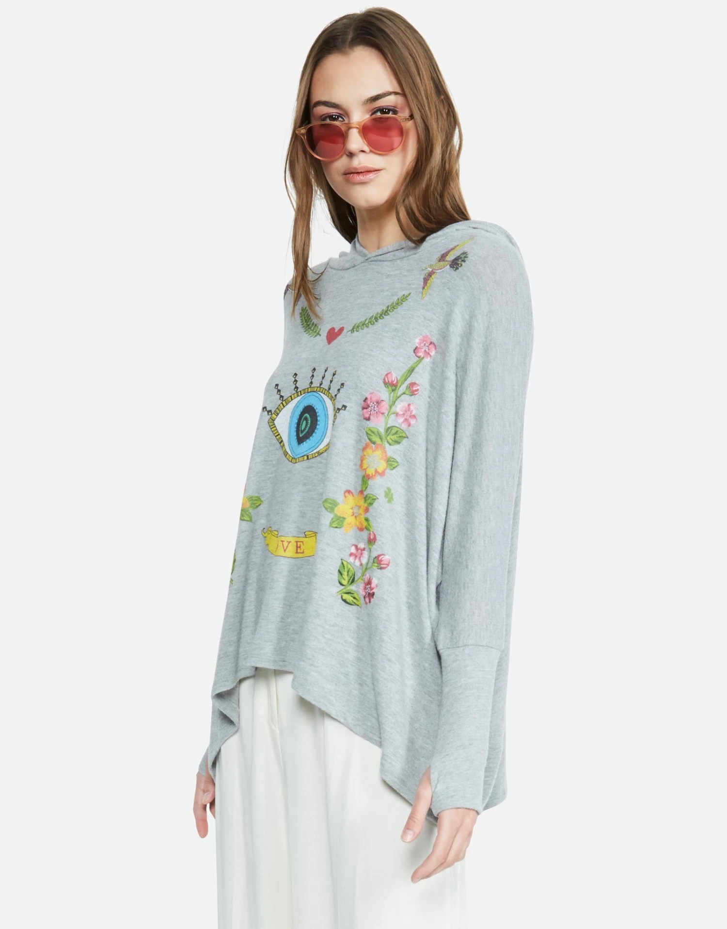 Floral Eye Love Printed on Ultra Soft Lightweight Hoodie in Heather Grey by Lauren Moshi.