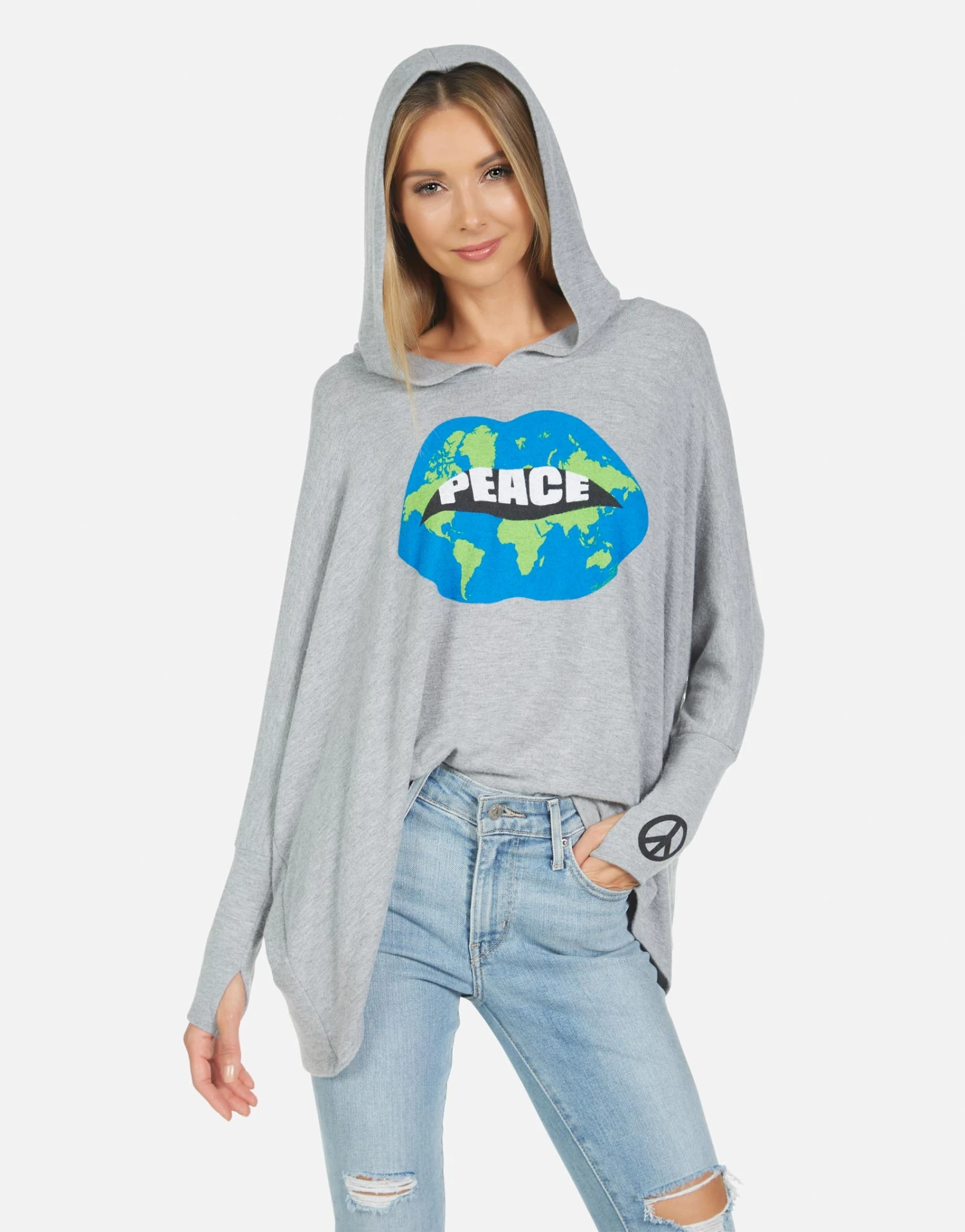World Peace Lips Printed on Ultra Soft Lightweight Hoodie in Heather Grey by Lauren Moshi.